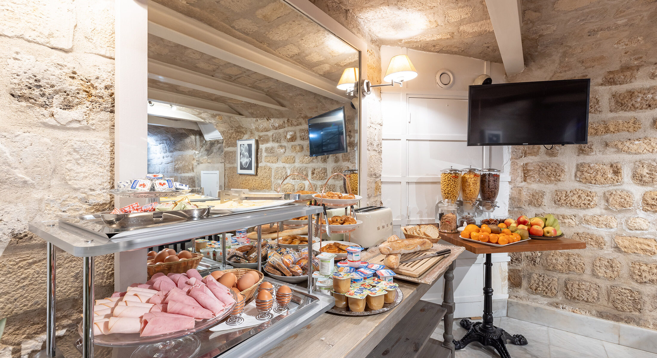 A day full of energy starts with a good full breakfast! Our breakfast includes hot and cold drinks, baguette, pastries, yoghurt, fresh fruit, ham, cheese, jam and spreads… A typical Parisian atmosphere and decor, with our vaulted room and exposed stonework.